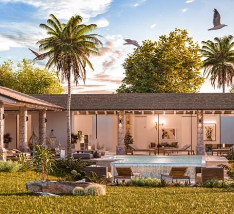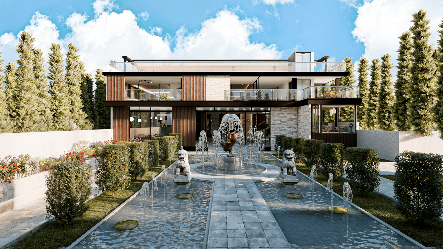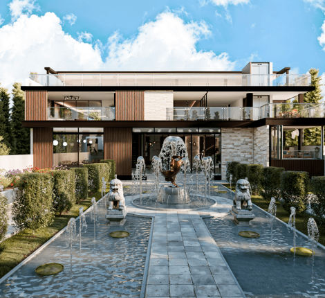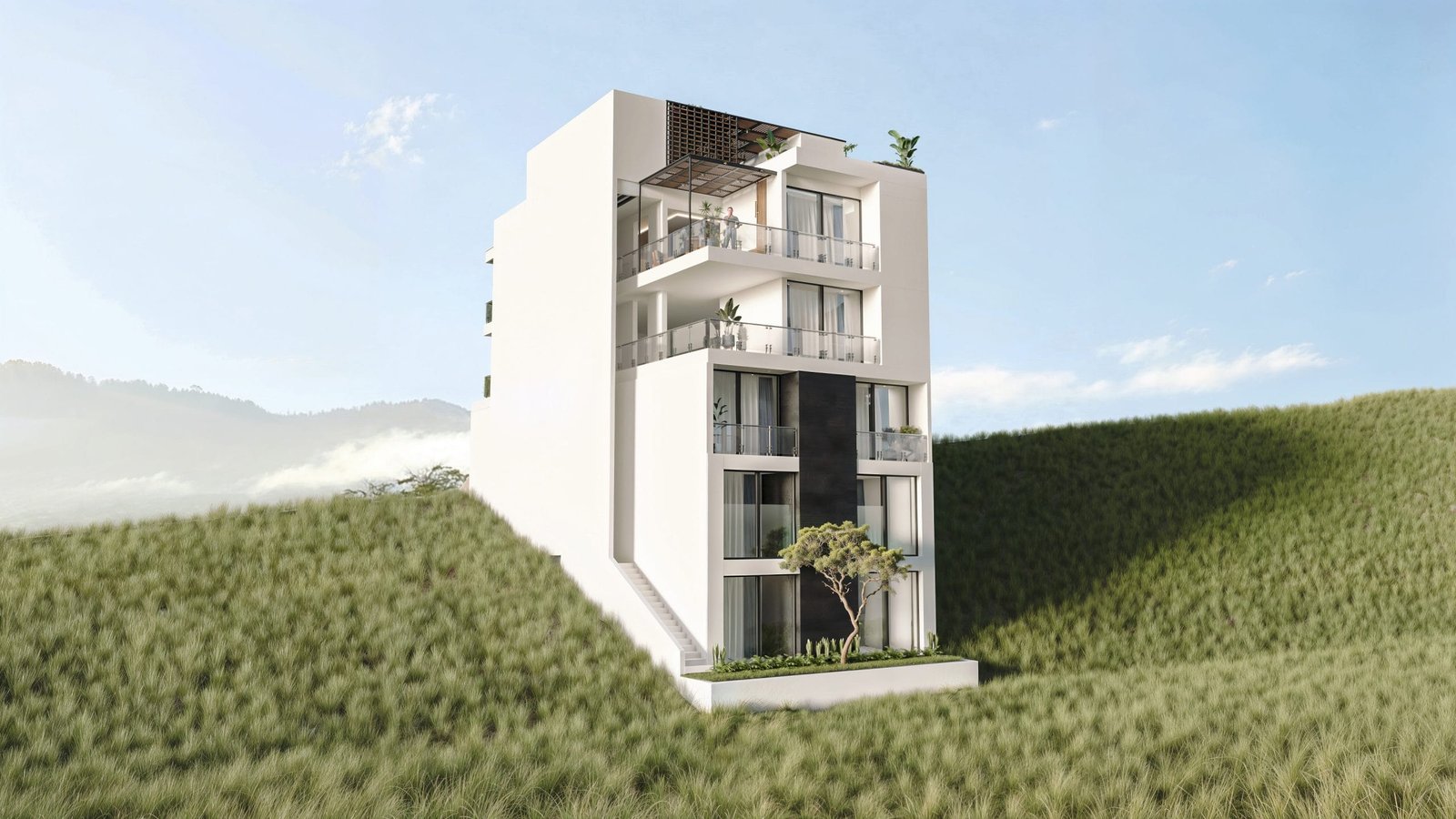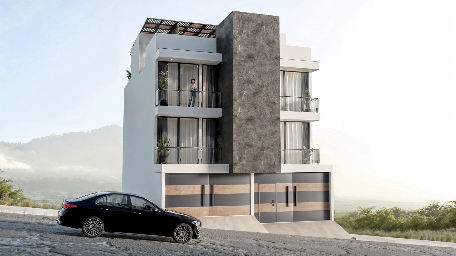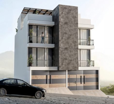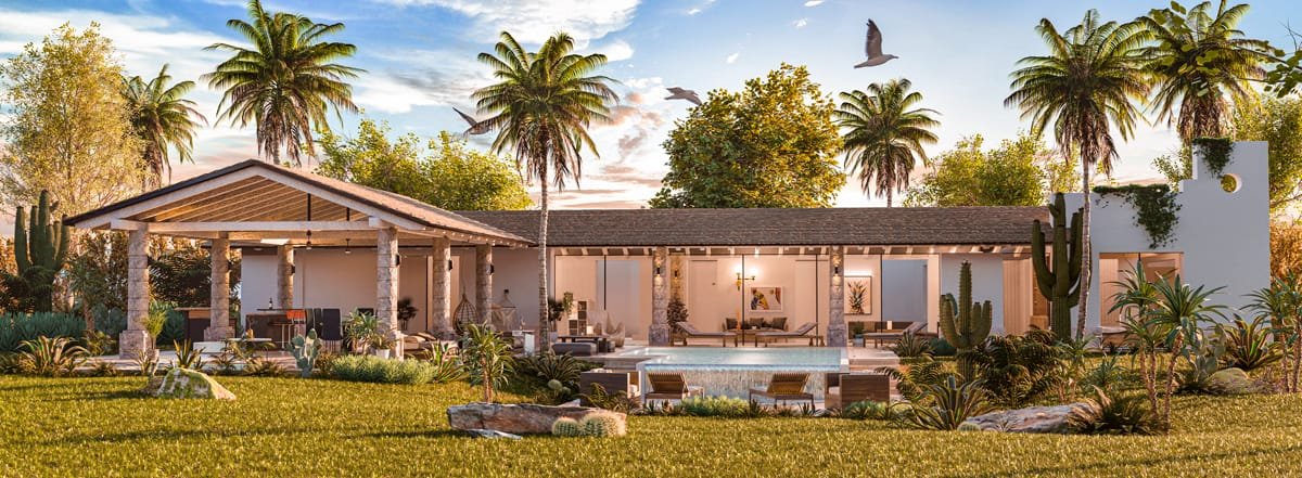 Renders 3D de exteriores y fachadas: viviendas, edificios y conjuntos con paisaje e iluminación realista.